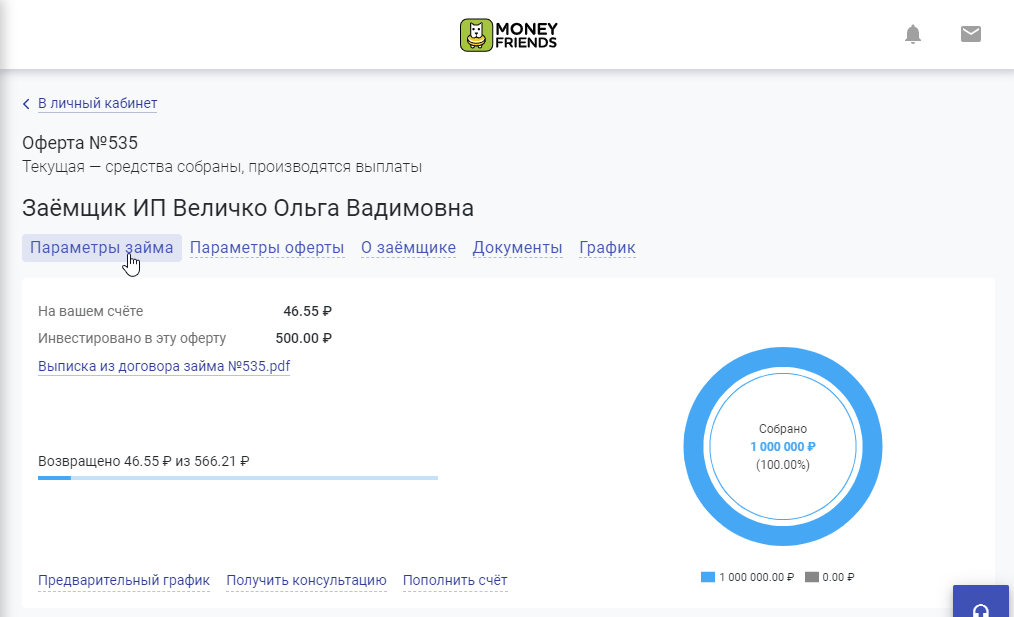 В отдельном окне выведены параметры займа, параметры оферты, информация о заёмщике и необходимые документы.