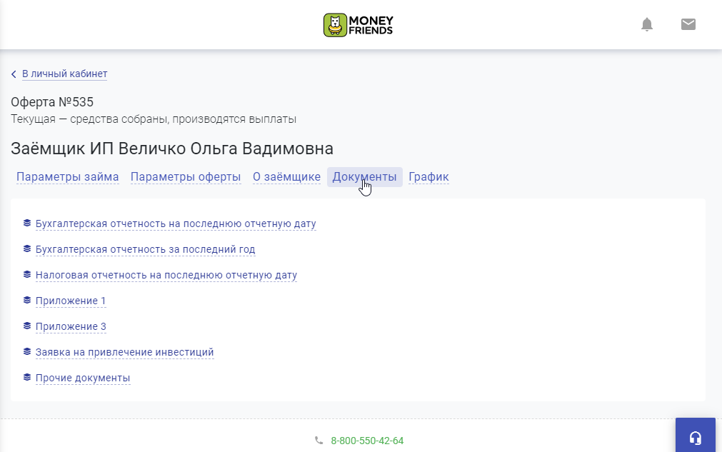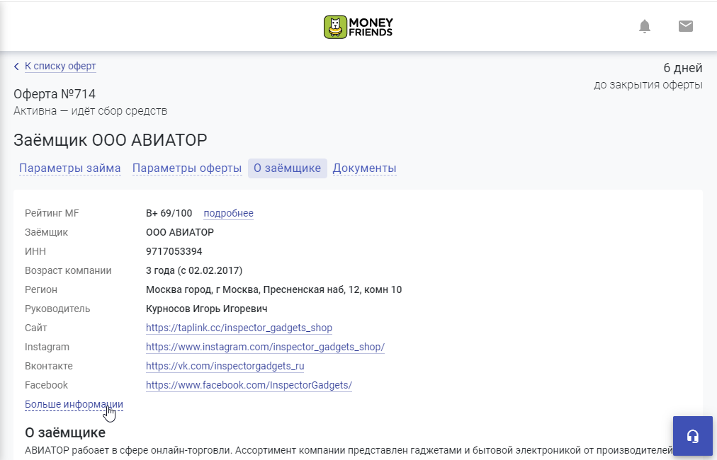 В отдельном окне выведены параметры займа, параметры оферты, информация о заёмщике и необходимые документы.
